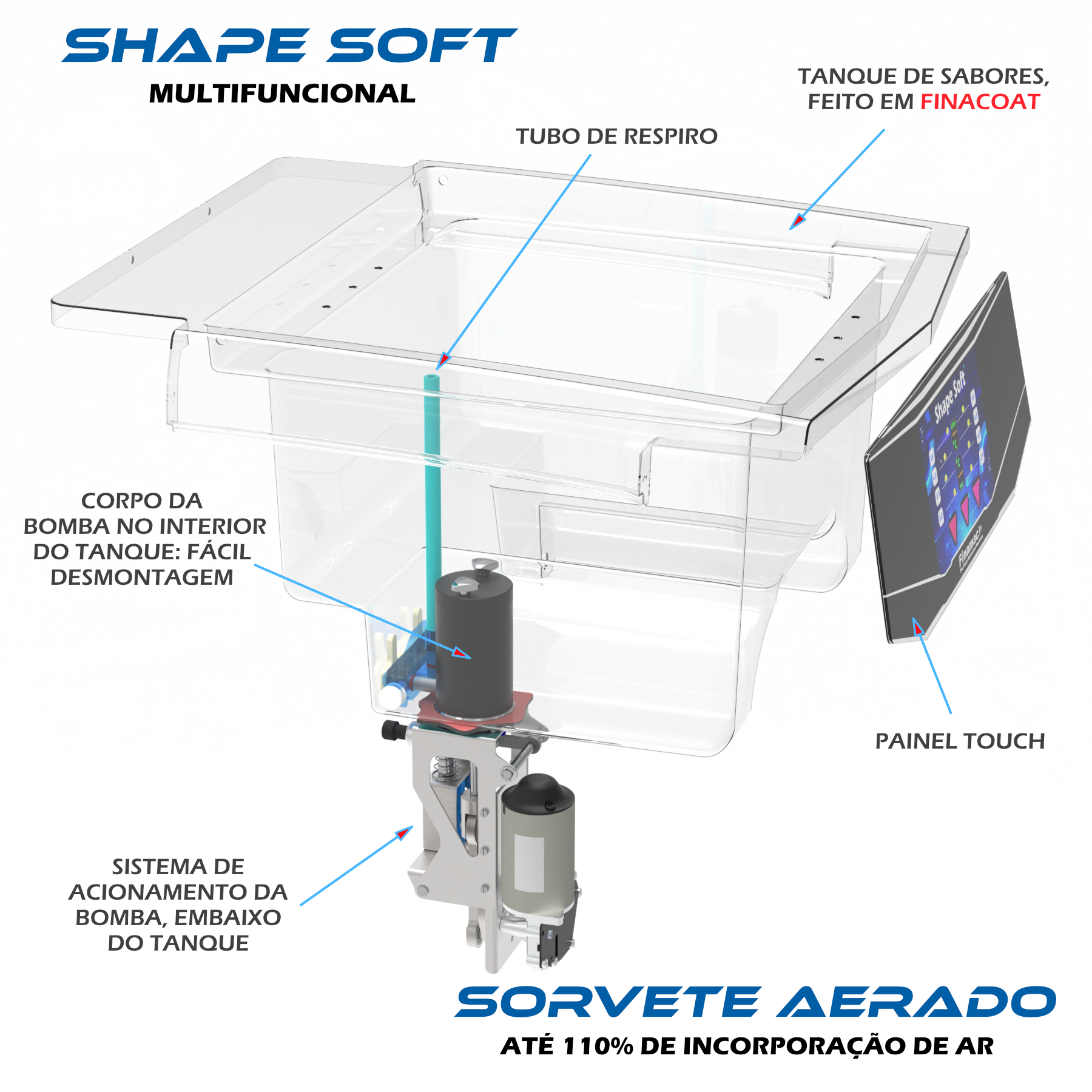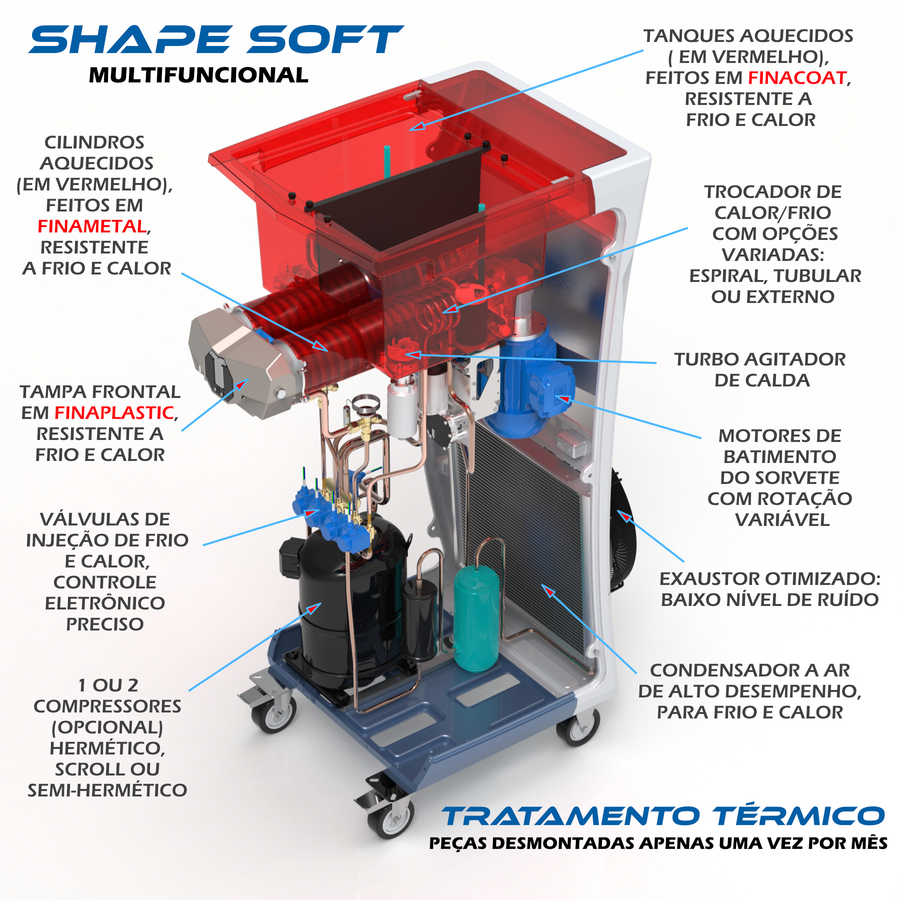 8- Finaheat é um sistema de aquecimento e resfriamento dos cilindros batedores de sorvete e tanques de sabores, de modo a prevenir microrganismos nocivos no produto e evitar desmontagem diária de peças para lavagem. A desmontagem e lavagem minuciosa de cada peça em contato com o alimento é feita apenas uma vez ao mês, diminuindo drasticamente a mão de obra.