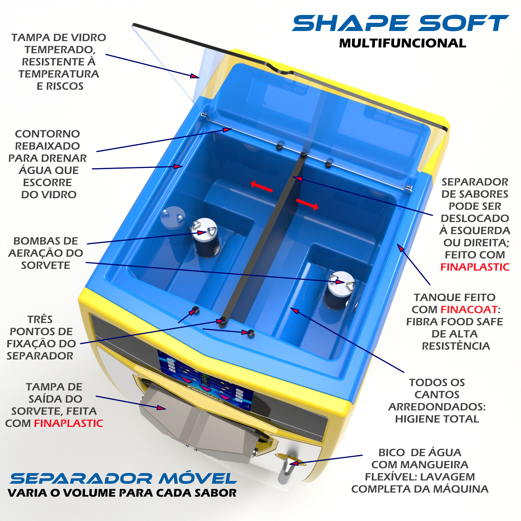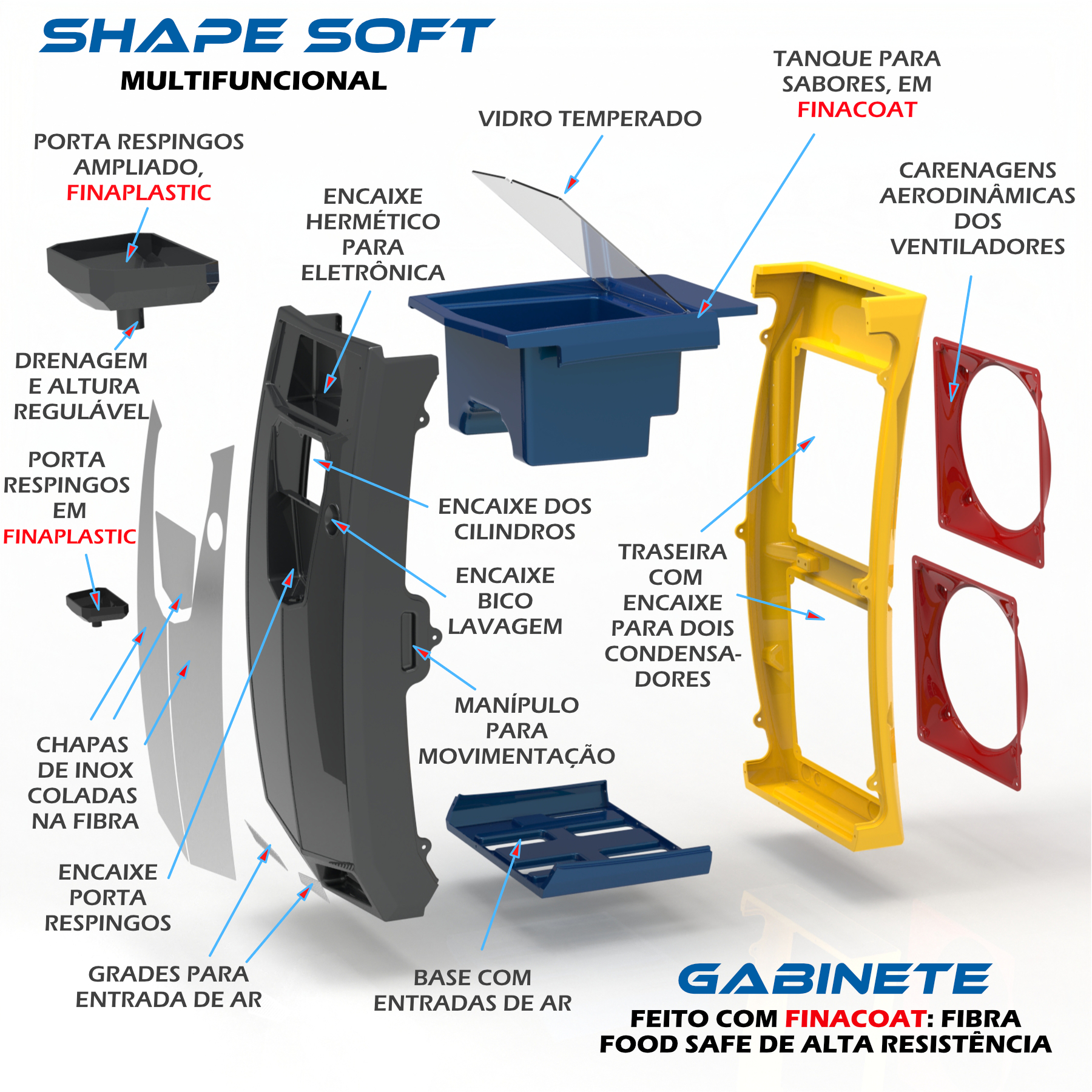 GANHOS IMPORTANTES NOS NEGÓCIOS - Utilizada em aeronaves e na F1, o gabinete é feito em fibra de alta resistência, sem cantos vivos, impossível de se obter com aço inoxidável. Fluxo de ar aerodinâmico: refrigeração eficiente. Máquina 40% mais leve e diversas cores para combinar com a decoração do negócio. Partes facilmente substituíveis. Utiliza FinaCoat em contato com alimento. Totalmente lavável. Atrai o consumidor ao ficar exposto: aumento significativo de vendas.