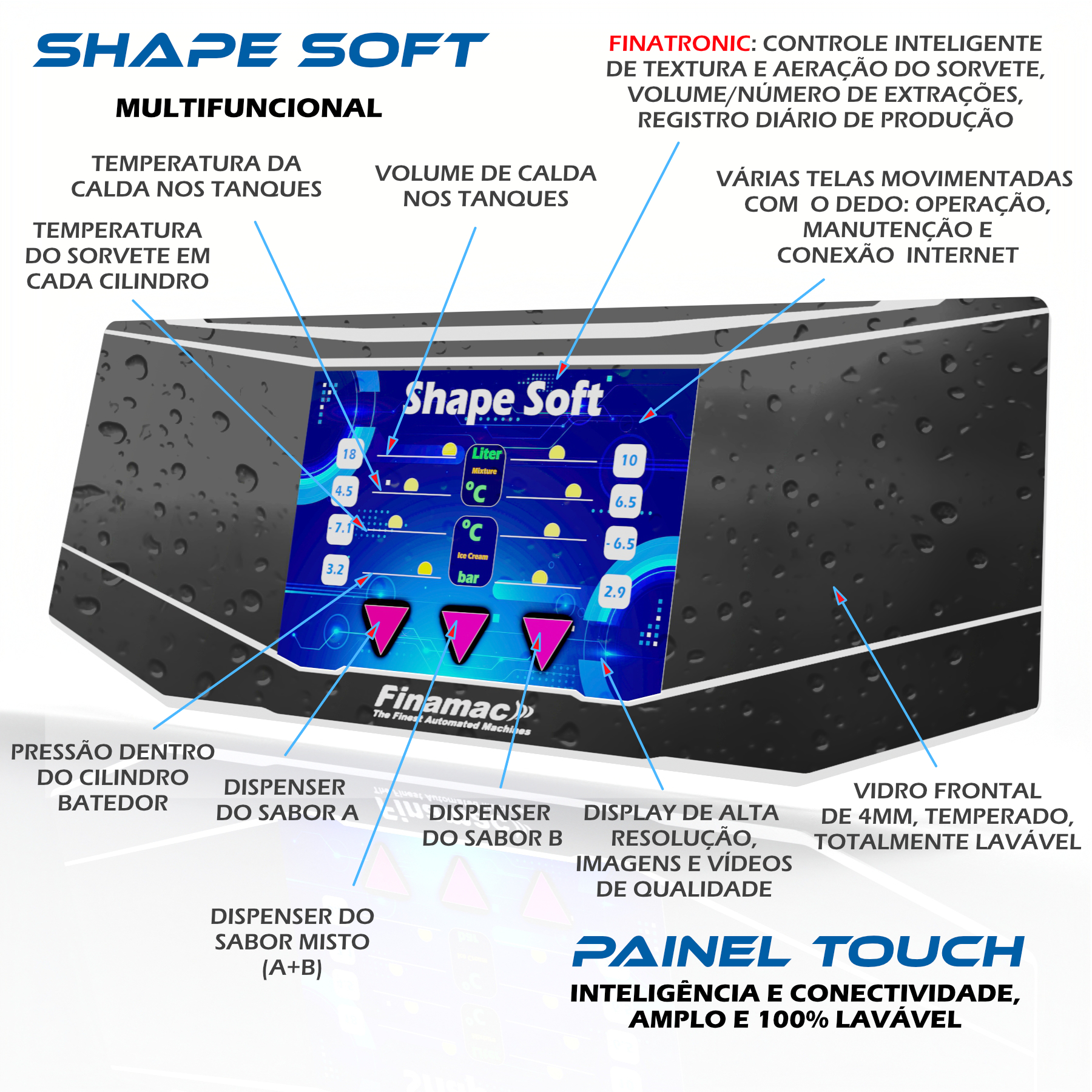 7- Finatronic é a eletrônica embarcada no equipamento, 100% proprietária e focada no processo de produção de sorvetes, preparada para inteligência artificial, conectividade, diagnósticos de manutenção e outras funcionalidades que aumentam os ganhos de forma visível no dia a dia de trabalho. Confiabilidade, robustez e segurança de funcionamento, com tecnologia digital de ponta.