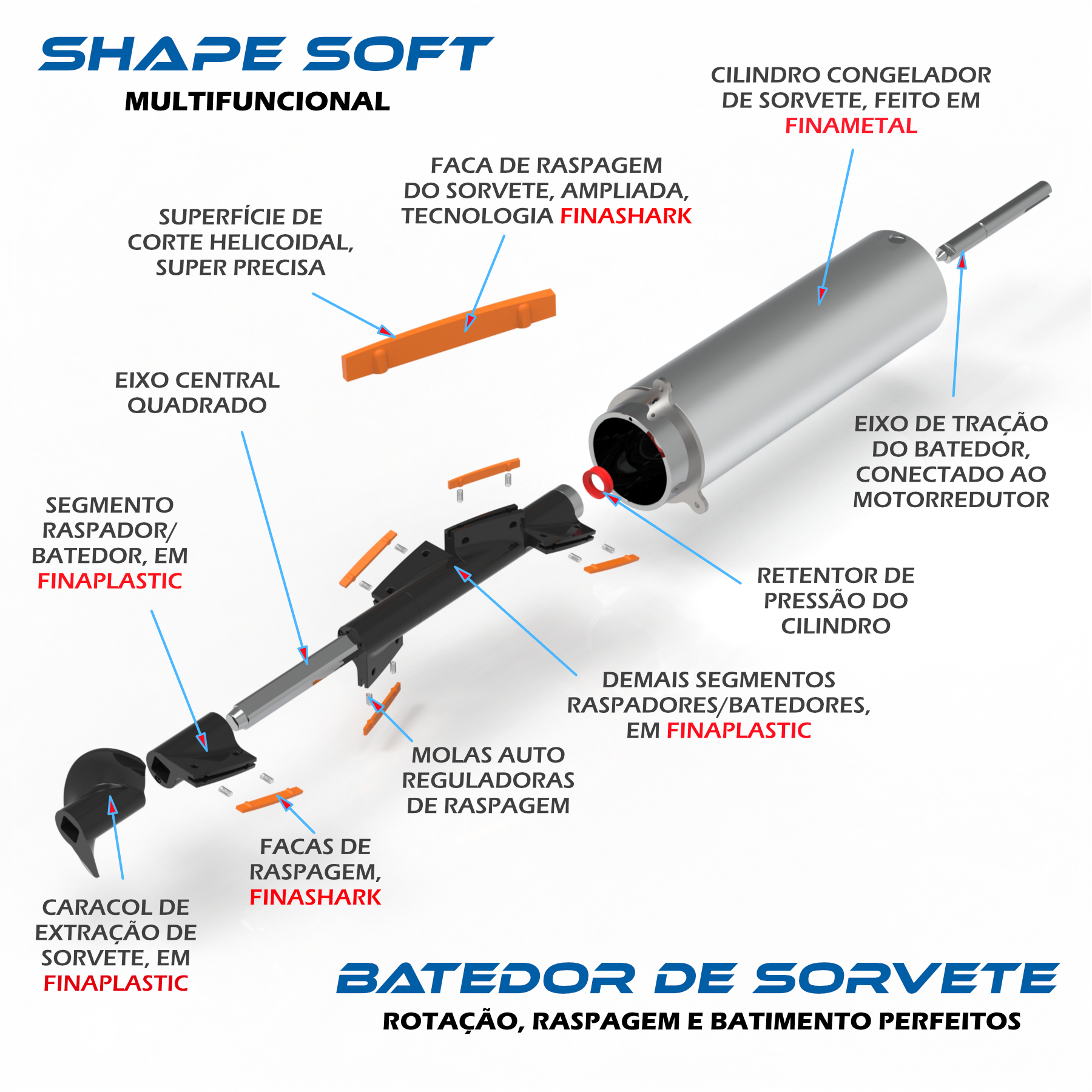 GANHOS IMPORTANTES NOS NEGÓCIOS - O sistema finashark garante sorvete firme e qualidade constante com facas apoiadas sobre molas, além de ser de baixíssimo custo de reposição. O batedor é composto de segmentos facilmente desmontáveis, de excelente aeração e fácil higienização. Com rotação variada eletronicamente, de acordo com o produto a ser processado, as partidas são sempre suaves: notável economia de energia. Suporta produção contínua com alta incorporação de ar, para copos/potes para distribuição.