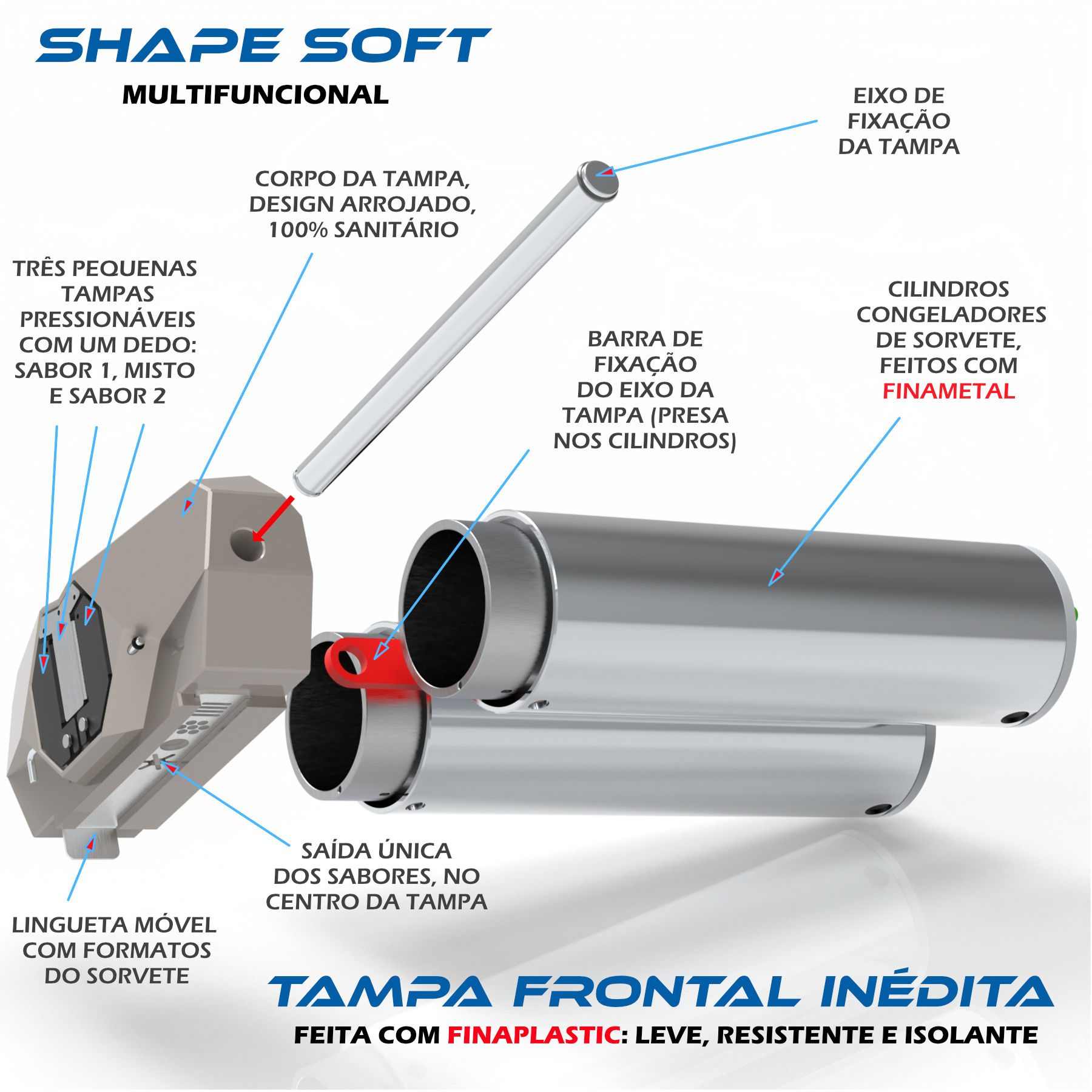 GANHOS IMPORTANTES NOS NEGÓCIOS - Única no mundo sem as tradicionais três alavancas das máquinas soft; são apenas três botões na tela touch ou três pequenas tampas articuladas para acionamento manual opcional de saída do sorvete. Saída dos sabores por orifício único, incluindo o sabor misto, com lingueta móvel para escolher o formato do sorvete (estrela, redondo, espaguete, filetes). A tampa não possui parafusos, apenas um ÚNICO EIXO de fixação; super higiênica e de fácil desmontagem.
