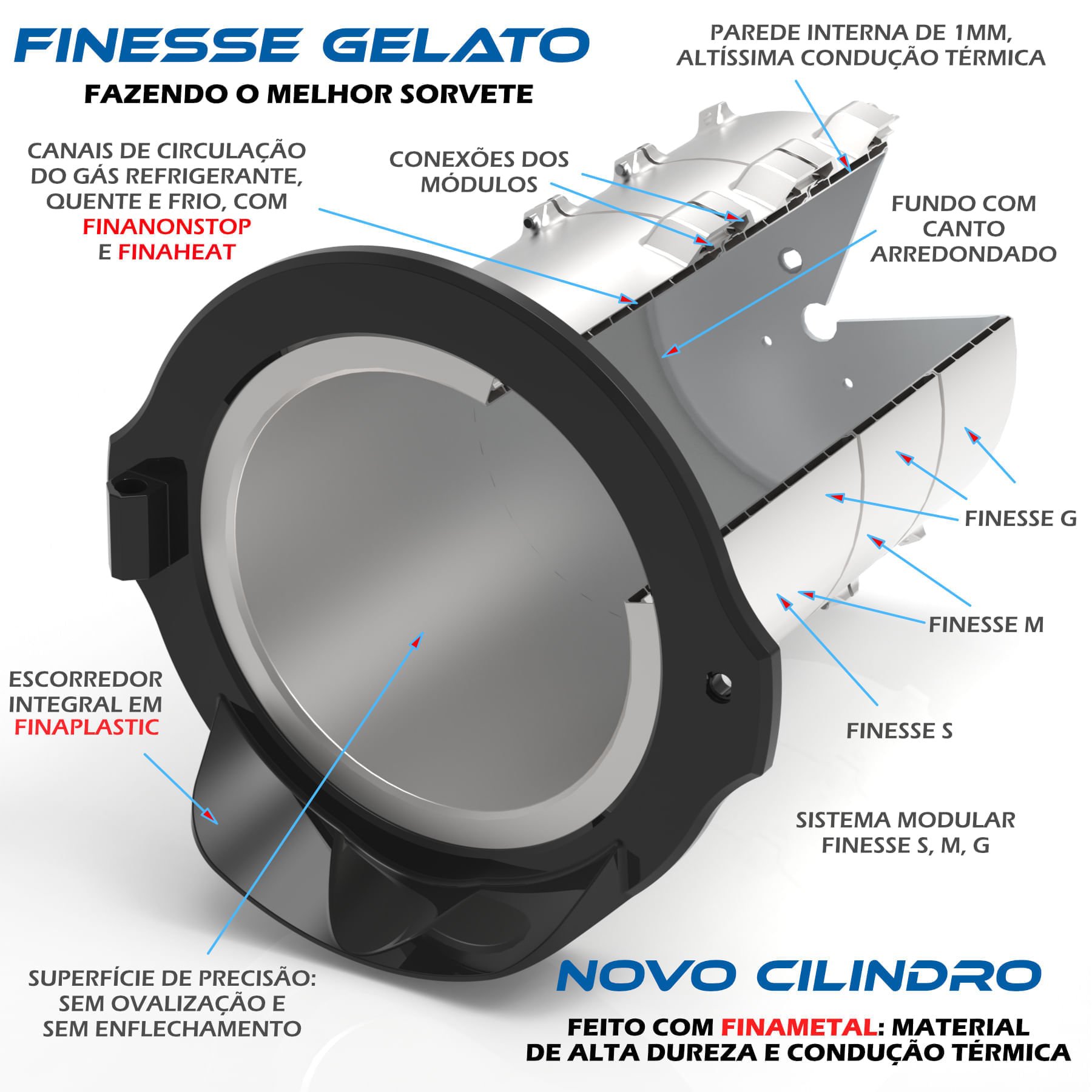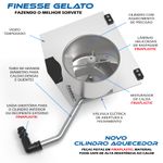 GANHOS IMPORTANTES NOS NEGÓCIOS - Construção integral em FinaMetal, sem soldas, material inoxidável de alta dureza, não desgasta, espessura de 1mm apenas, super condução térmica, congela em poucos minutos. Aquece misturas rapidamente com FINAHEAT. Eixo de tração do batedor dentro do cilindro (No. 4, acima), higiene total. Utiliza FINANONSTOP para acelerar produção. Facilmente desmontável pela frente da máquina. Montagem 100% sanitária. Diâmetro amplo de 269mm.