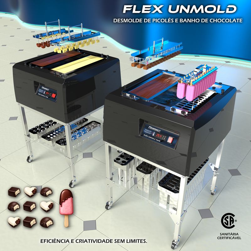 Além da função de 'desenformar', permite a fabricação de picolés SKIMO, com cobertura de chocolate.