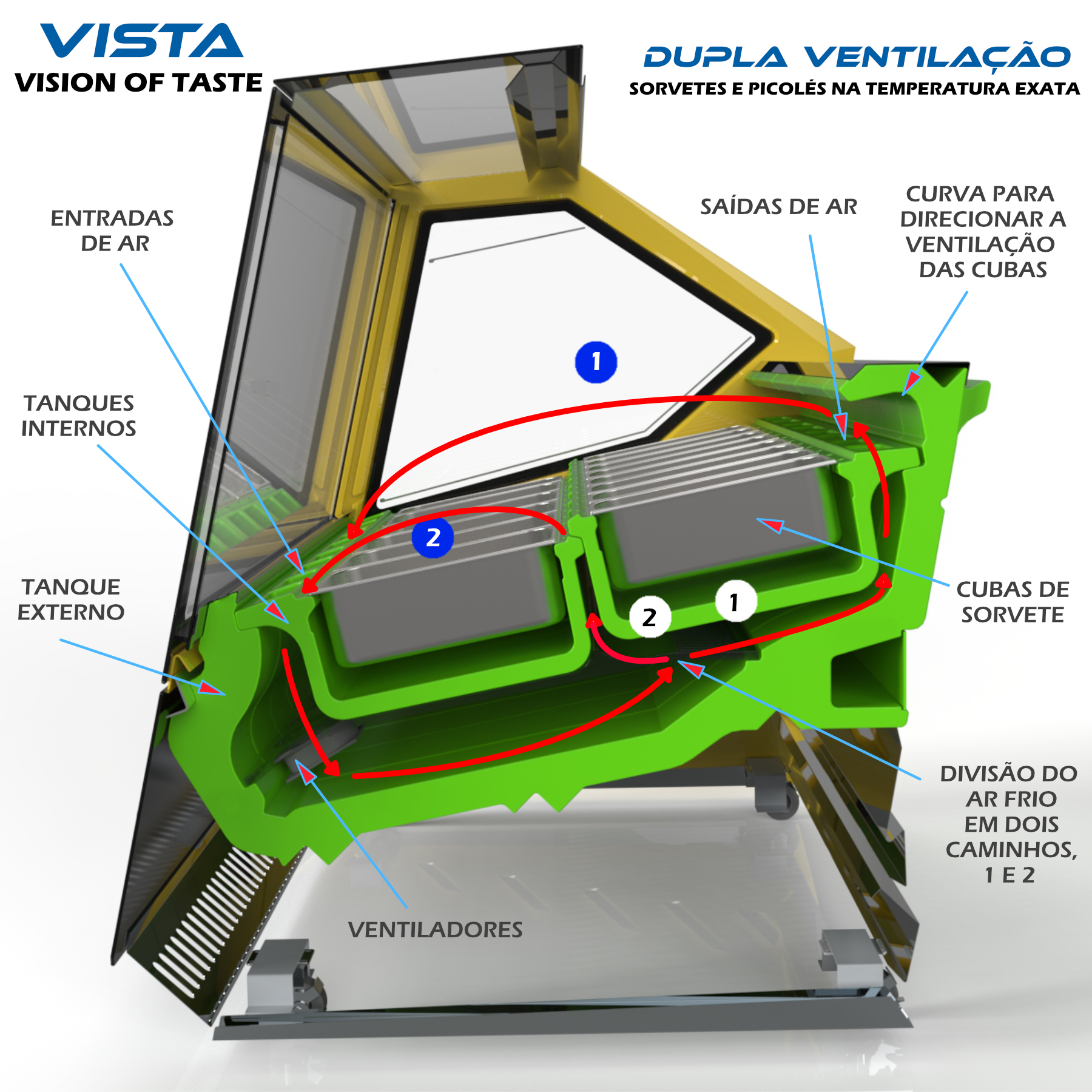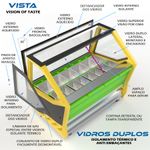 GANHOS IMPORTANTES NOS NEGÓCIOS - Sorvetes e o picolés na consistência adequada fazem com que os clientes sempre retornem. Isso somente é possível com dupla ventilação sobre os produtos, que mantém a temperatura da vitrine com variação máxima de 1ºC. Também possibilita a decoração das cubas com sorvete bem elevado, chamando ainda mais a atenção. É uma solução tecnológica que aumenta as vendas.
