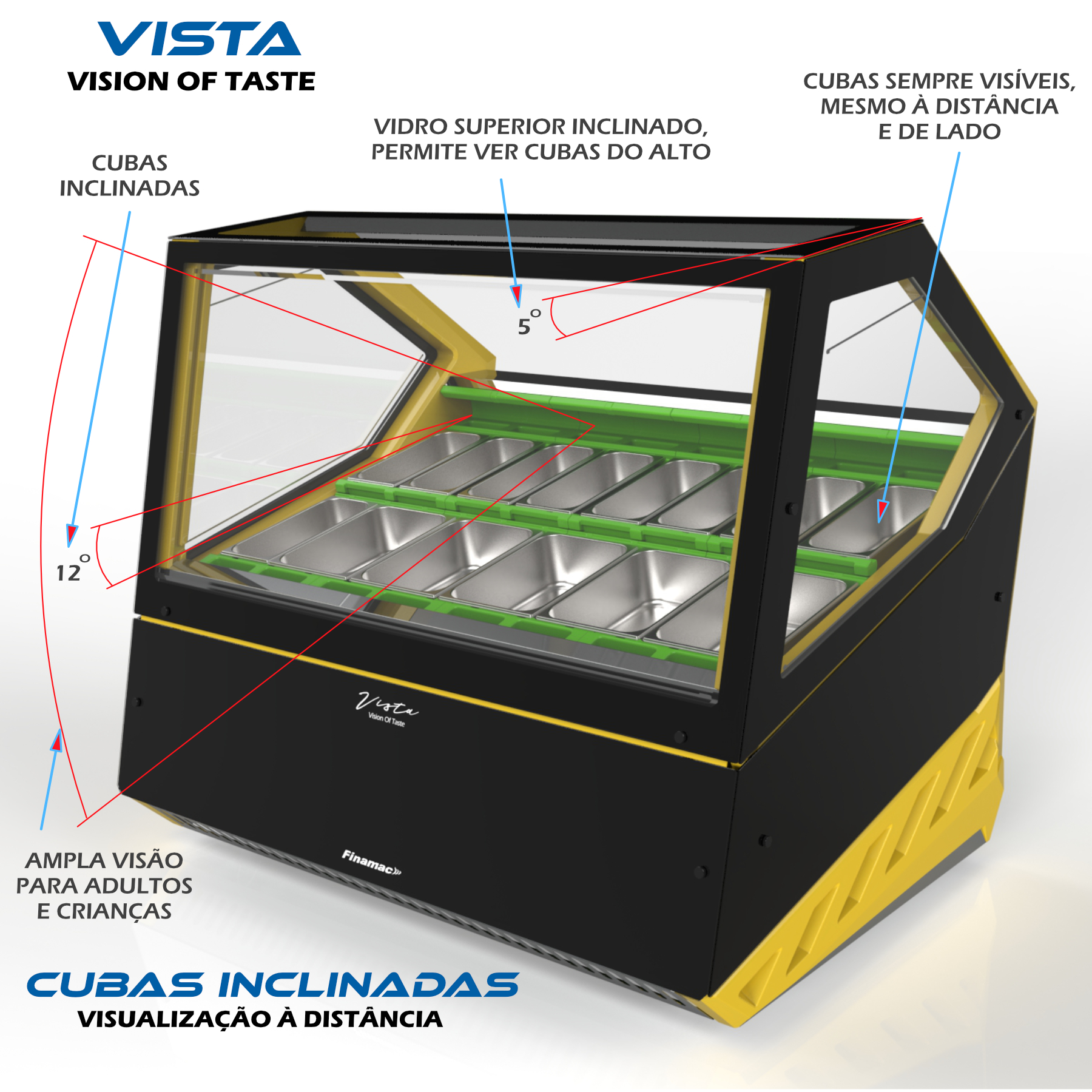 GANHOS IMPORTANTES NOS NEGÓCIOS - Comemos pelos olhos, daí a importância da vitrine despertar o desejo do consumidor. A forte inclinação das cubas (12 graus) aumenta a visibilidade tanto de perto quanto à distância, para adultos e crianças. O vidro superior inclinado facilita a visualização de quem se aproxima da vitrine.