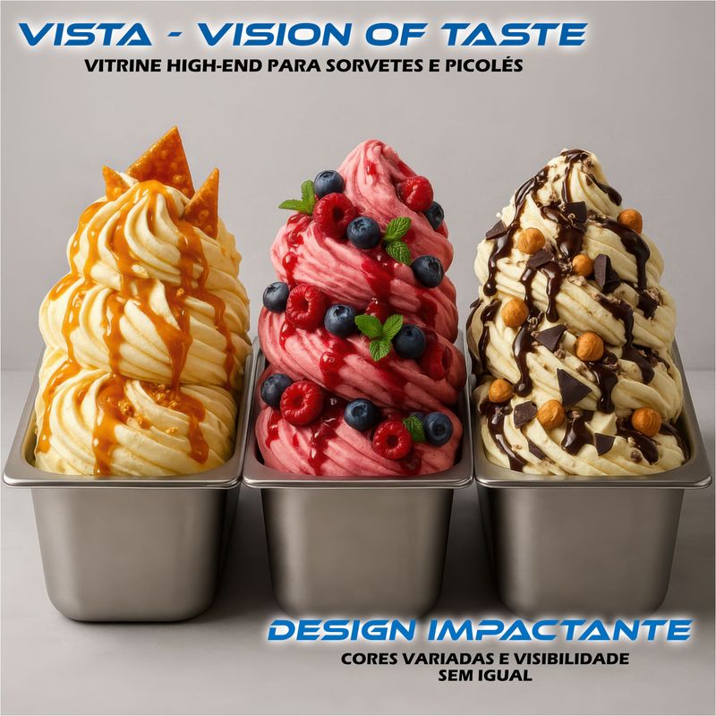GANHOS IMPORTANTES NOS NEGÓCIOS - A exposição de sorvetes e picolés aumenta as vendas em pelo menos 40%, daí as gelaterias com vitrines estarem cada vez mais tomando espaços no mundo todo, com expressiva lucratividade. A decoração elevada de sorvetes veio para ficar e é a atração principal numa gelateria. Para isso, a vitrine precisa ser construída com as cubas bem inclinadas e posicionadas na parte mais alta do equipamento.