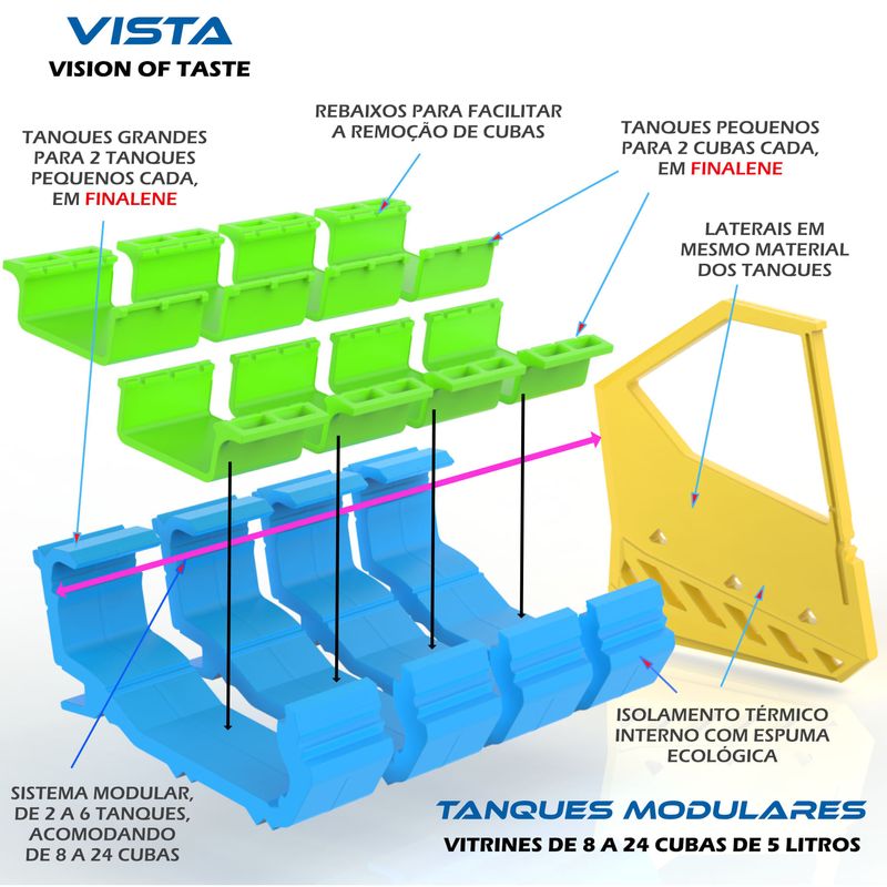 GANHOS IMPORTANTES NOS NEGÓCIOS - Tanques grandes, pequenos e laterais em finalene em várias cores; isolamento térmico sem igual, com espuma isolante ecológica. Tanques grandes aerodinâmicos: excelente distribuição de frio. Tanques pequenos fáceis de desmontar e lavar, com rebaixos para facilitar remoção das cubas. Ganho de tempo de limpeza, garantia de não contaminação e economia de energia, pois o calor externo não passa facilmente por esses materiais.