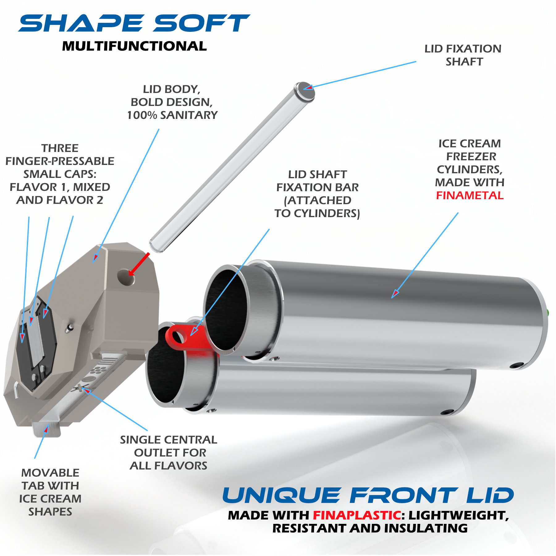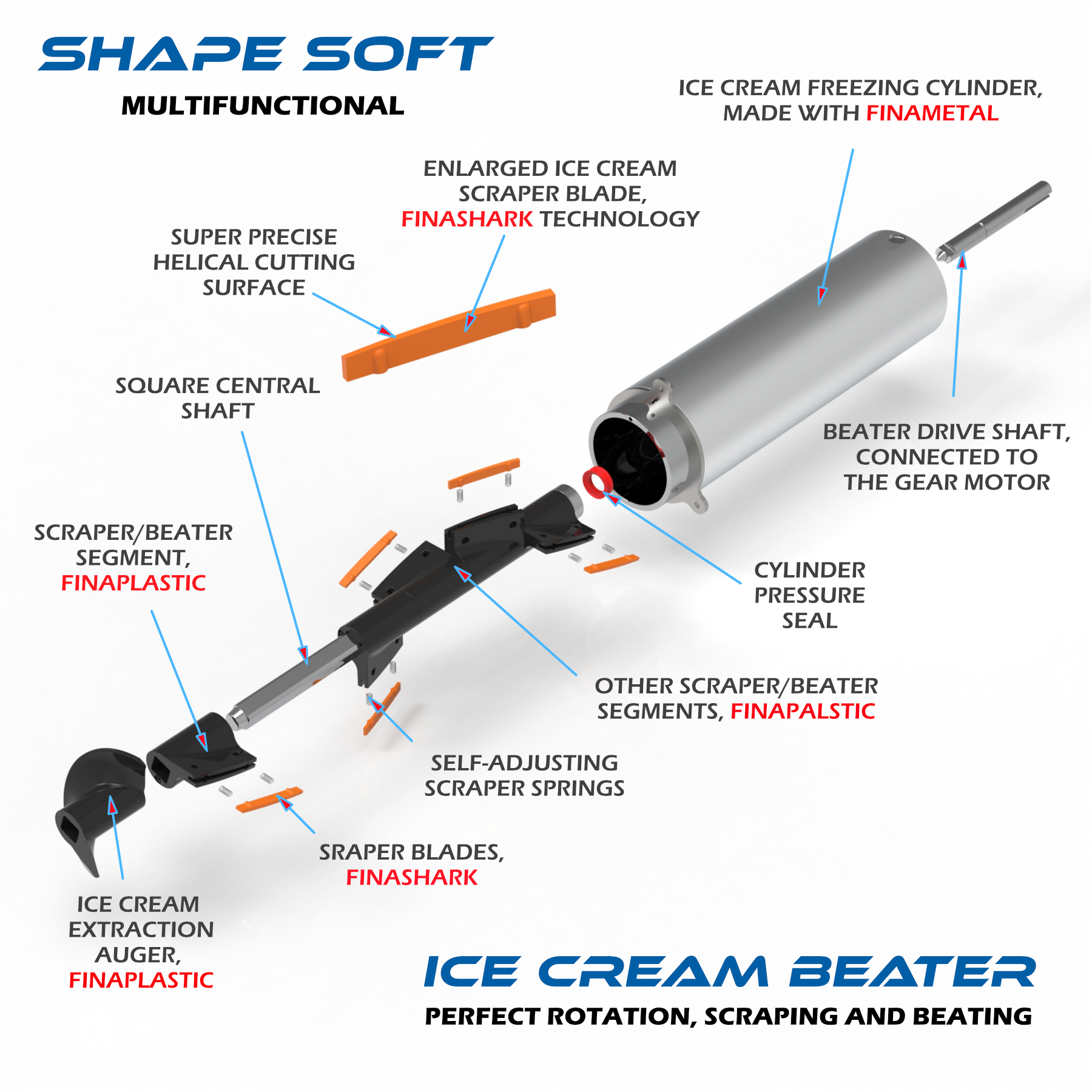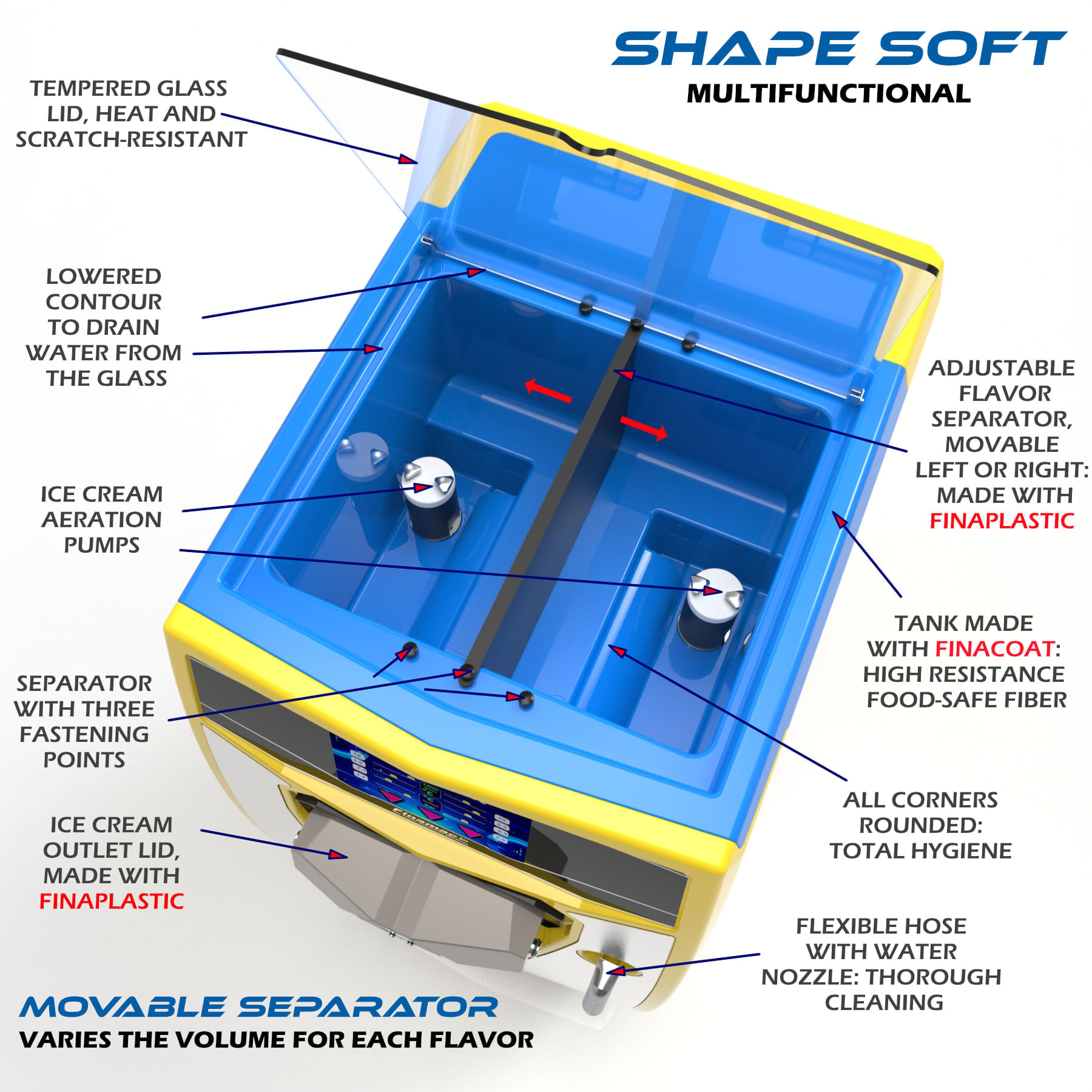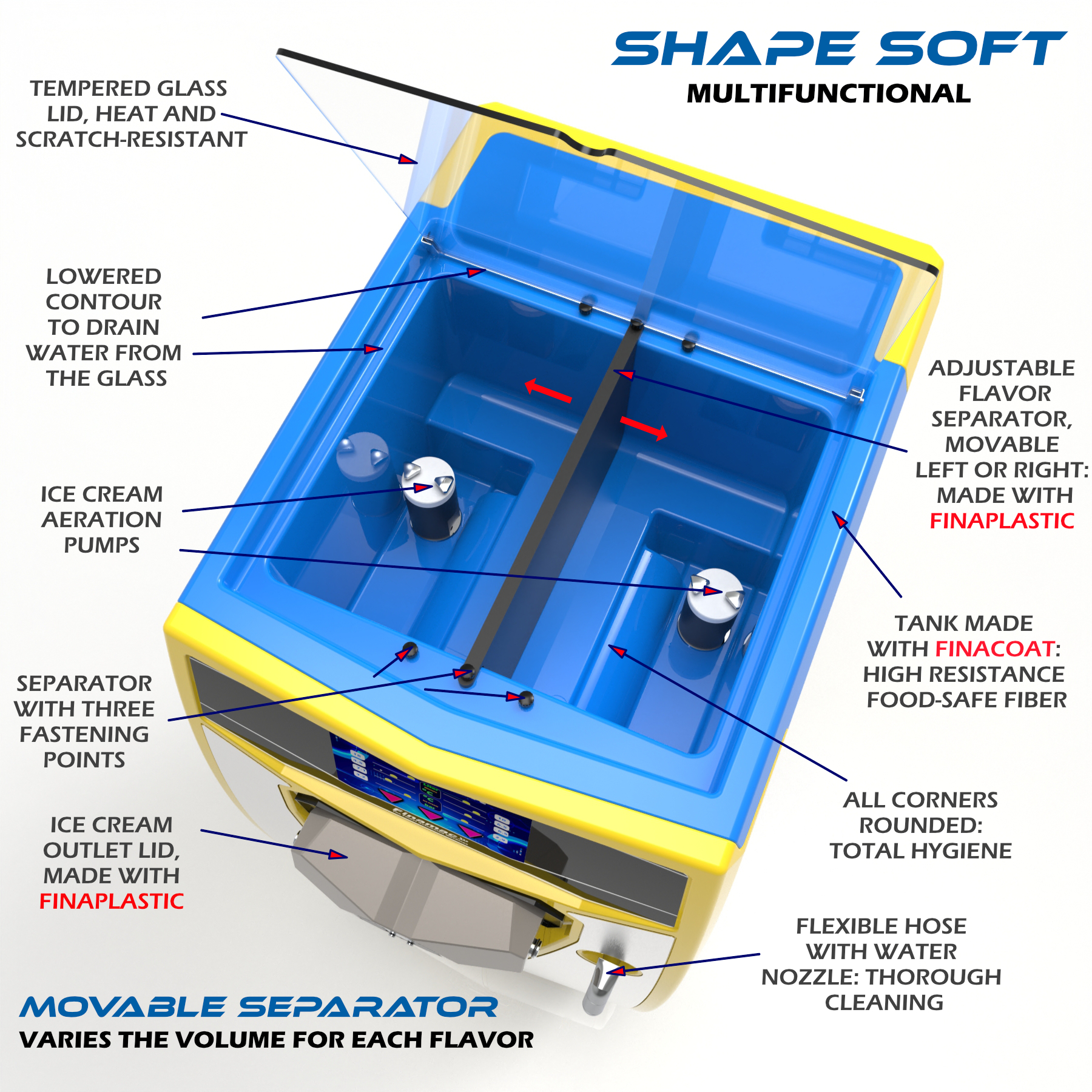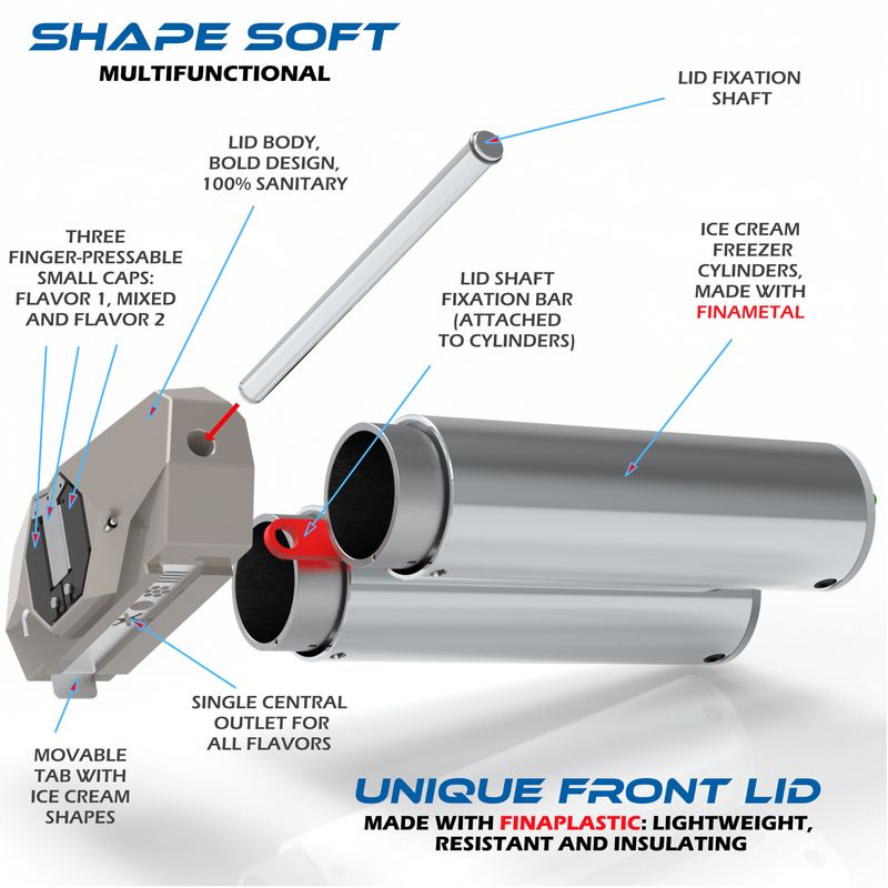 1- FinaPlastic is a certified plastics manufacturing process, exclusive of Finamac, starting from selected components that result in material that is inert to contact with food and the human body, very light, with high mechanical resistance, high resistance to heat and cold, high thermal insulation and low adhesion to ice cream. The process allows the manufacture of complex parts in a single body, without seams and without sharp corners, a technology similar to that used in the aerospace industry. The culmination of many years of engineering research devoted to the creation of high-quality ice cream.