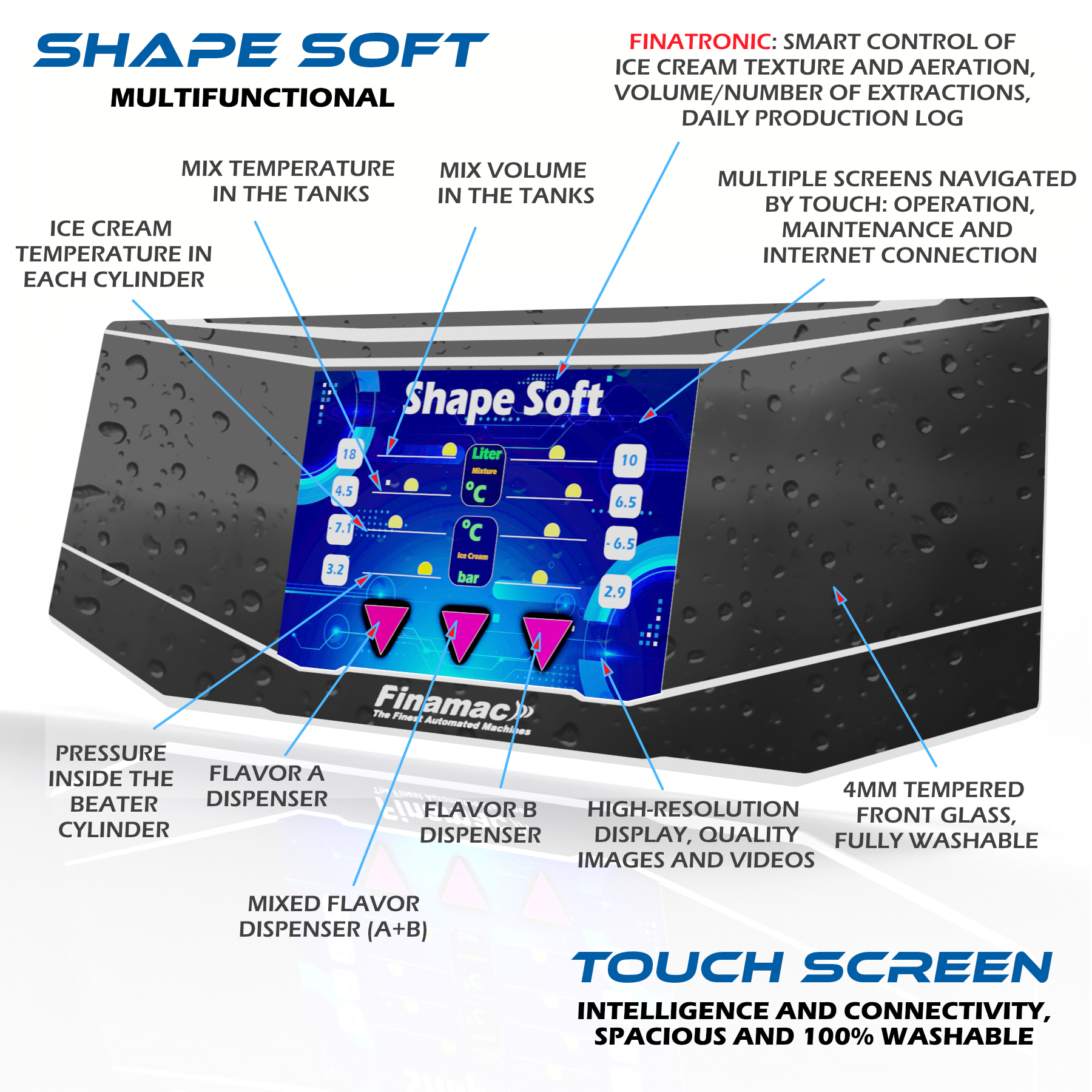 IMPORTANT GAINS IN BUSINESS - Intelligent consistency control ensures a higher percentage of frozen water and smaller ice crystals, delivering extraordinary quality that strongly attracts consumers. Featuring a wide tempered glass panel, fully washable, and a 10” high-resolution touch display with extensive connectivity, operation, and maintenance features. Powered by finatronic hardware and software, developed specifically for ice cream production.