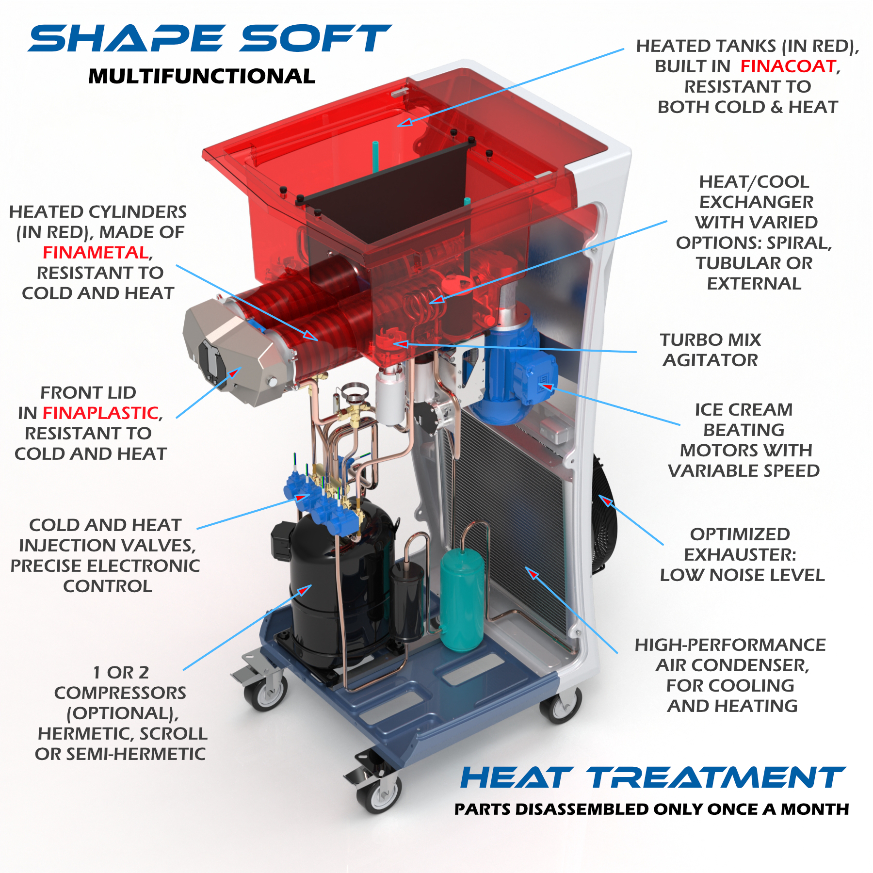 8- Finaheat A heating and cooling system for the ice cream beater cylinders and flavor tanks, designed to prevent harmful microorganisms in the product and eliminate the need for daily disassembly for cleaning. Complete disassembly and thorough washing of all food-contact parts is required only once a month, drastically reducing labor.