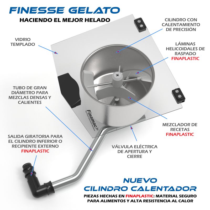 7- Finaheat es un sistema de calor para calentar el cilindro donde se bate el helado, permitiendo que un solo cilindro sirva como pasteurizador de jarabe, con posterior congelación, o producir cremas de confitería de varios tipos. Baja inversión.
