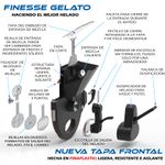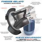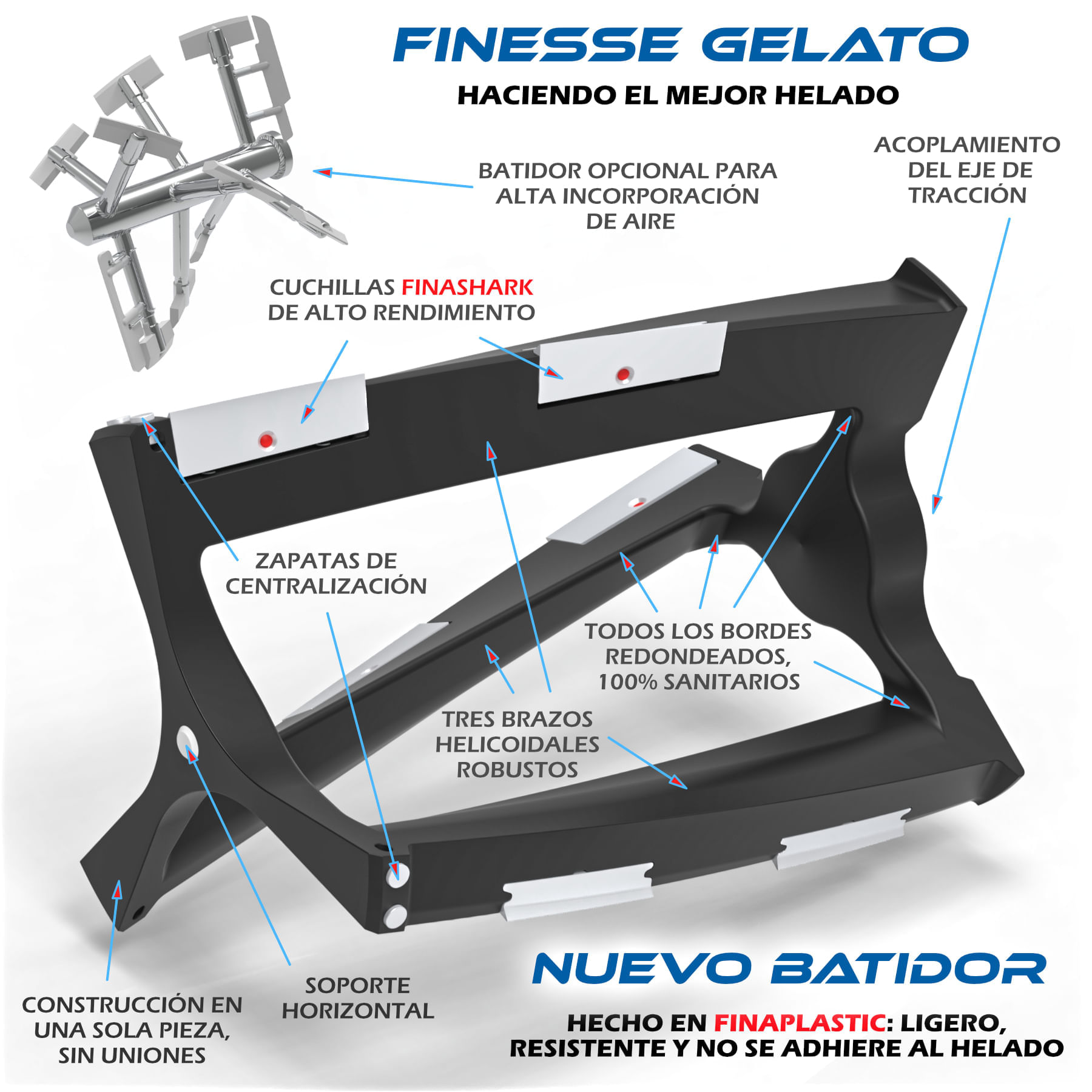 IMPORTANTES GANANCIAS EN LOS NEGOCIOS - Robustos brazos de FinaPlastic, esquinas redondeadas, acoplamiento metálico del eje de transmisión, zapatas de centrado y sistema de cuchillas FinaShark; helado seco y consistente, listo para servir. Ligero, resistente, muy fácil de limpiar y no se adhiere al helado. Bajo costo. Batidor opcional para incorporación de aire hasta un 70%, ya establecido en el mercado en las máquinas Finamac PRO-4 y PRO-16.