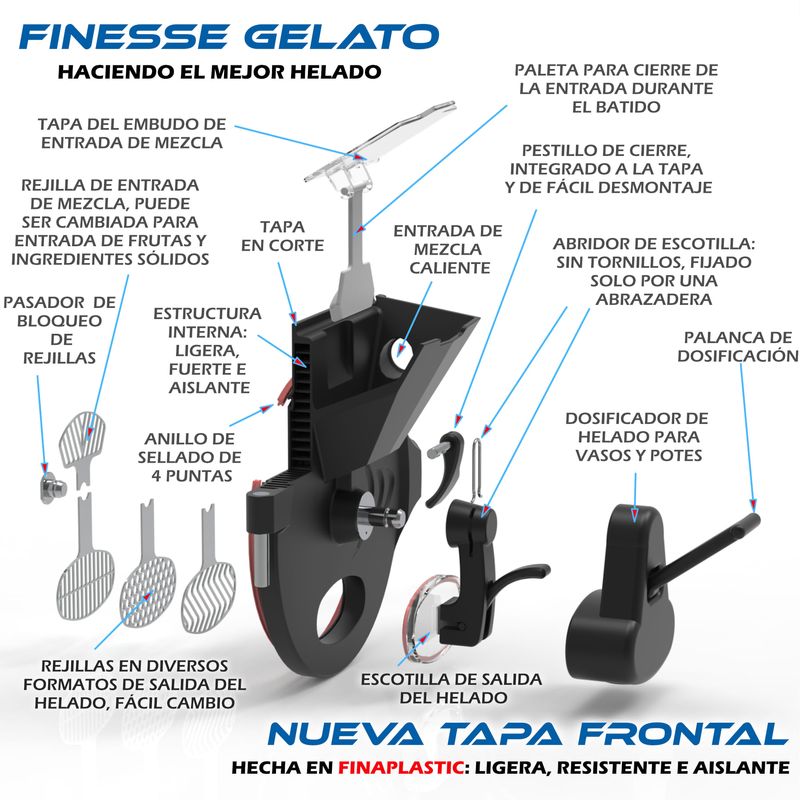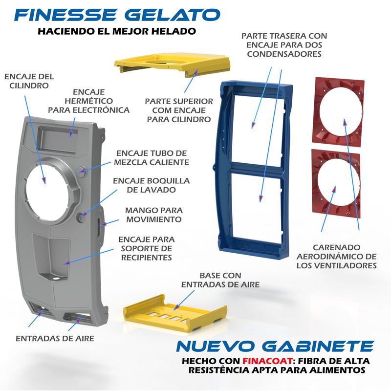 2- FinaPlastic es un proceso de fabricación de plásticos certificado, exclusivo de Finamac, a partir de componentes seleccionados que dan como resultado un material inerte al contacto con los alimentos y el cuerpo humano, muy ligero, con alta resistencia mecánica, alta resistencia al calor y al frío, alto aislamiento térmico y baja adherencia al helado. El proceso permite la fabricación de piezas complejas en un solo cuerpo, sin costuras y sin esquinas afiladas, una tecnología similar a la utilizada en la industria aeroespacial. Es el resultado de muchos años de investigación en ingeniería dedicados a la fabricación de helados de alta calidad.