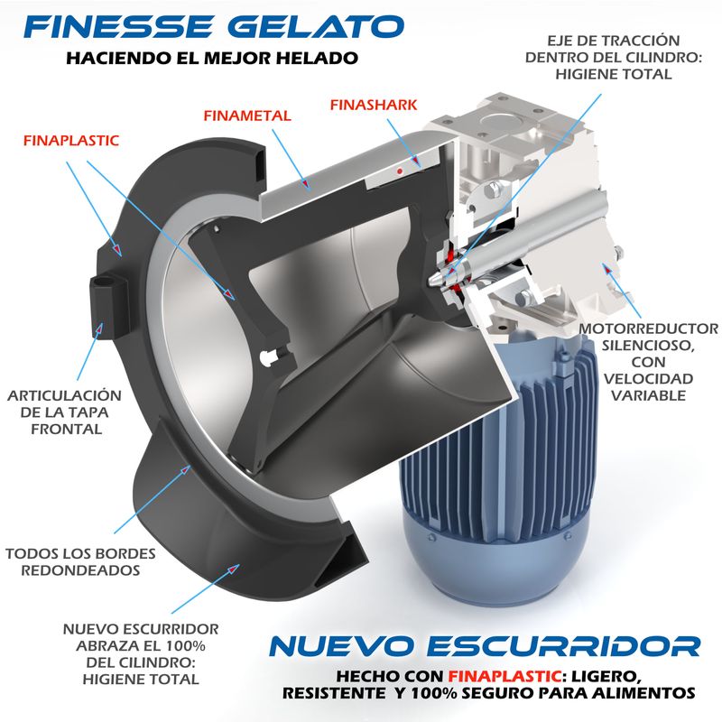 3- FinaShark (Softening Hardness Aided by Rotating Knurling) es un proceso de raspado de helados basado en la potencia de corte de los dientes de tiburón, que proporciona una reducción del 30% en el esfuerzo del motor eléctrico que mueve el batidor/raspador, además de reducir drásticamente el tamaño de los cristales de hielo formados, dando como resultado un helado mucho más cremoso, estable y duradero. Cuchillas fabricadas en plástico especial apoyadas en muelles para facilitar el desmontaje y la limpieza. No retiene helado ni libera residuos nocivos.