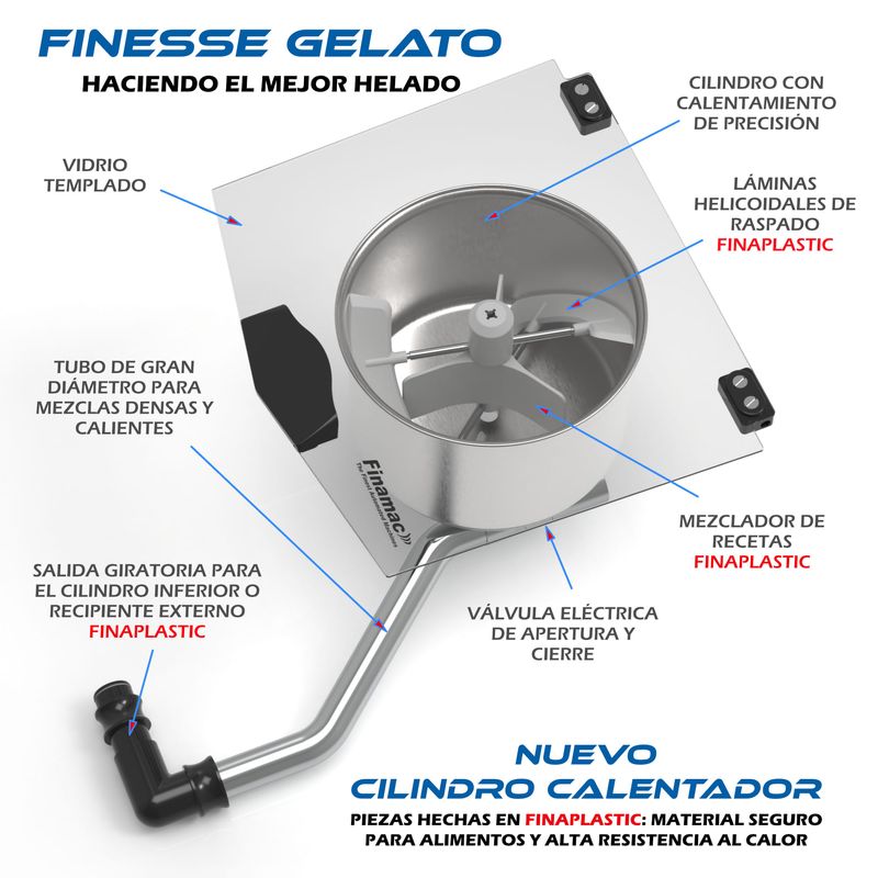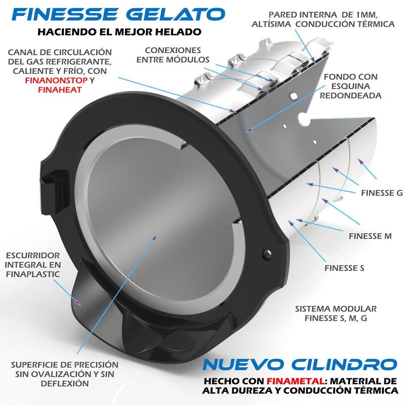 IMPORTANTES GANANCIAS EN LOS NEGOCIOS - Construcción integral en FinaMetal, sin soldaduras, material inoxidable de alta dureza, no se desgasta, solo 1 mm de espesor, súper conducción térmica, se congela en pocos minutos. Calienta las mezclas rápidamente con FINAHEAT. Eje de transmisión del batidor dentro del cilindro (No. 4, arriba), higiene total. Utiliza FINANONSTOP para acelerar la producción. Se desmonta fácilmente desde la parte delantera de la máquina. Montaje 100% sanitario. Diámetro ancho de 269mm.