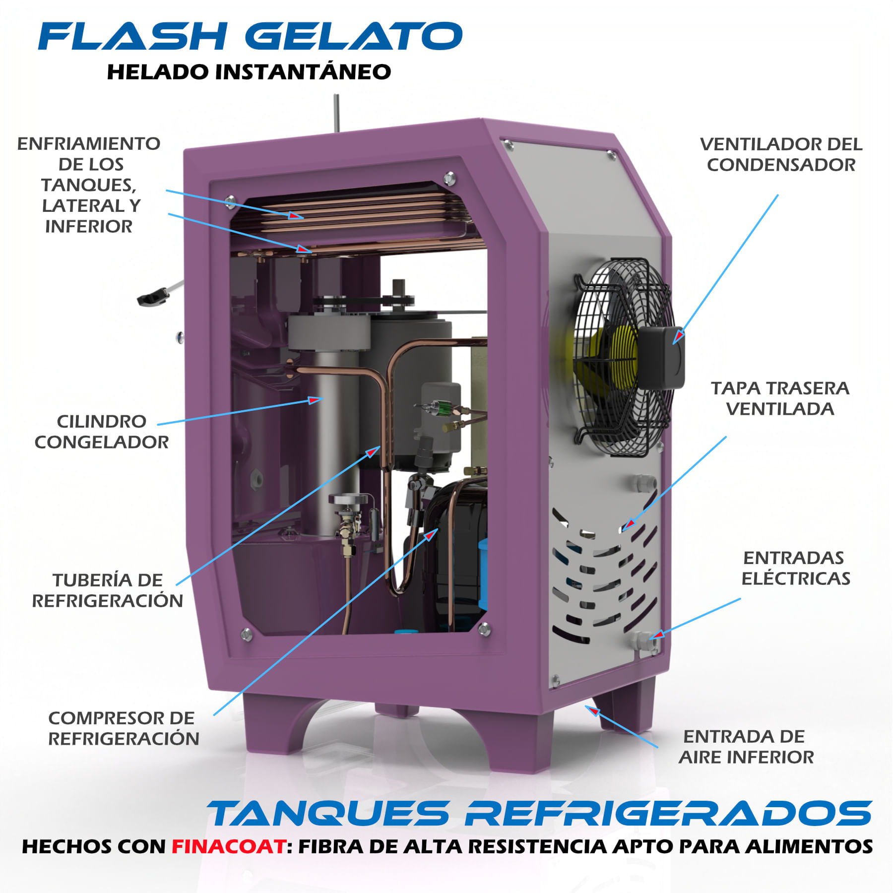 IMPORTANTES GANANCIAS EN LOS NEGOCIOS - Utilizado en aviones y autos de carreras, el gabinete está hecho de fibra de alta resistencia, sin esquinas afiladas, imposible de obtener con chapas de acero inoxidable. Flujo de aire aerodinámico: refrigeración eficiente. Máquina un 40% más ligera y varios colores para combinar con la decoración del negocio. Piezas fácilmente reemplazables. Emplea FinaCoat en contacto con alimentos. Totalmente lavable. Atrae al cliente final al estar expuesto: aumento de las ventas.