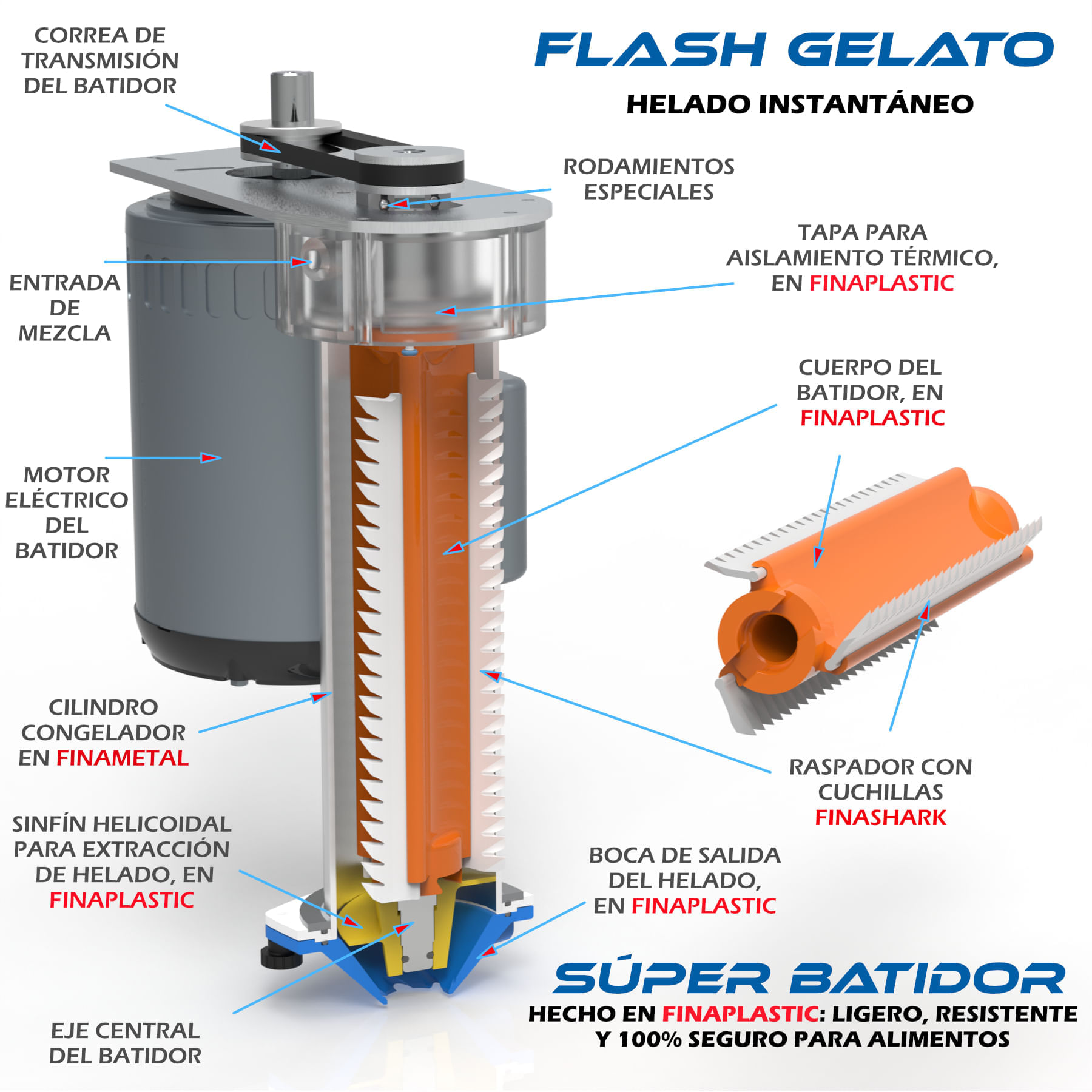 2- FinaShark (Softening Hardness Aided by Rotating Knurling) es un proceso de raspado de helado basado en la potencia de corte de los dientes de tiburón, que proporciona una reducción del 30% en el esfuerzo del motor eléctrico que mueve el batidor/raspador, además de reducir drásticamente el tamaño de los cristales de hielo formados, dando como resultado un helado mucho más cremoso, estable y duradero. Cuchillas fabricadas en plástico especial para facilitar el desmontaje y la limpieza. No retiene helado ni libera residuos nocivos.