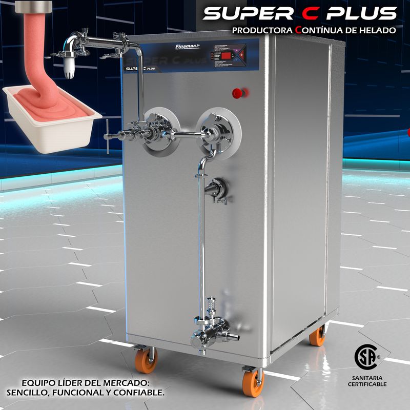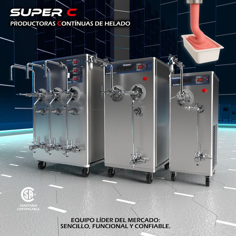 Equipo automático para la fabricación de helados a base de agua (piña, limón, etc.) o leche (chocolate, fresas, vainilla, etc.) con alta entrada de aire.