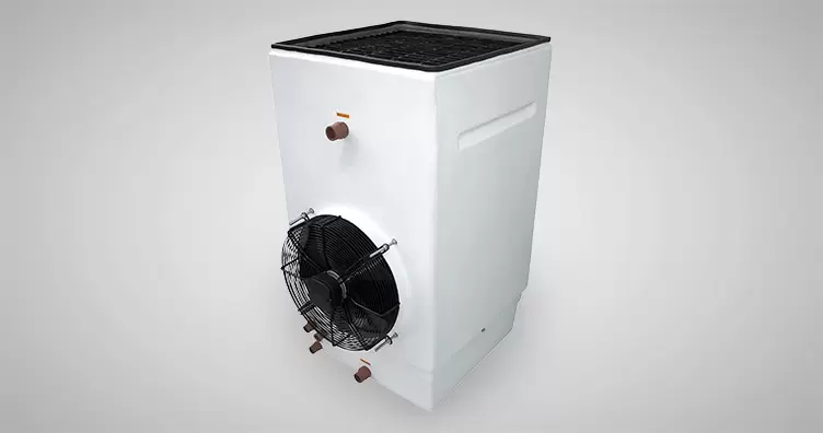Aquí viene la torre de refrigeración por agua, que no es más que un rociador de agua caliente con un flujo de aire más frío a contracorriente. El agua caliente que sale de la máquina para hacer helados/helados se pulveriza y se enfría mediante un potente ventilador, y vuelve a la máquina con la